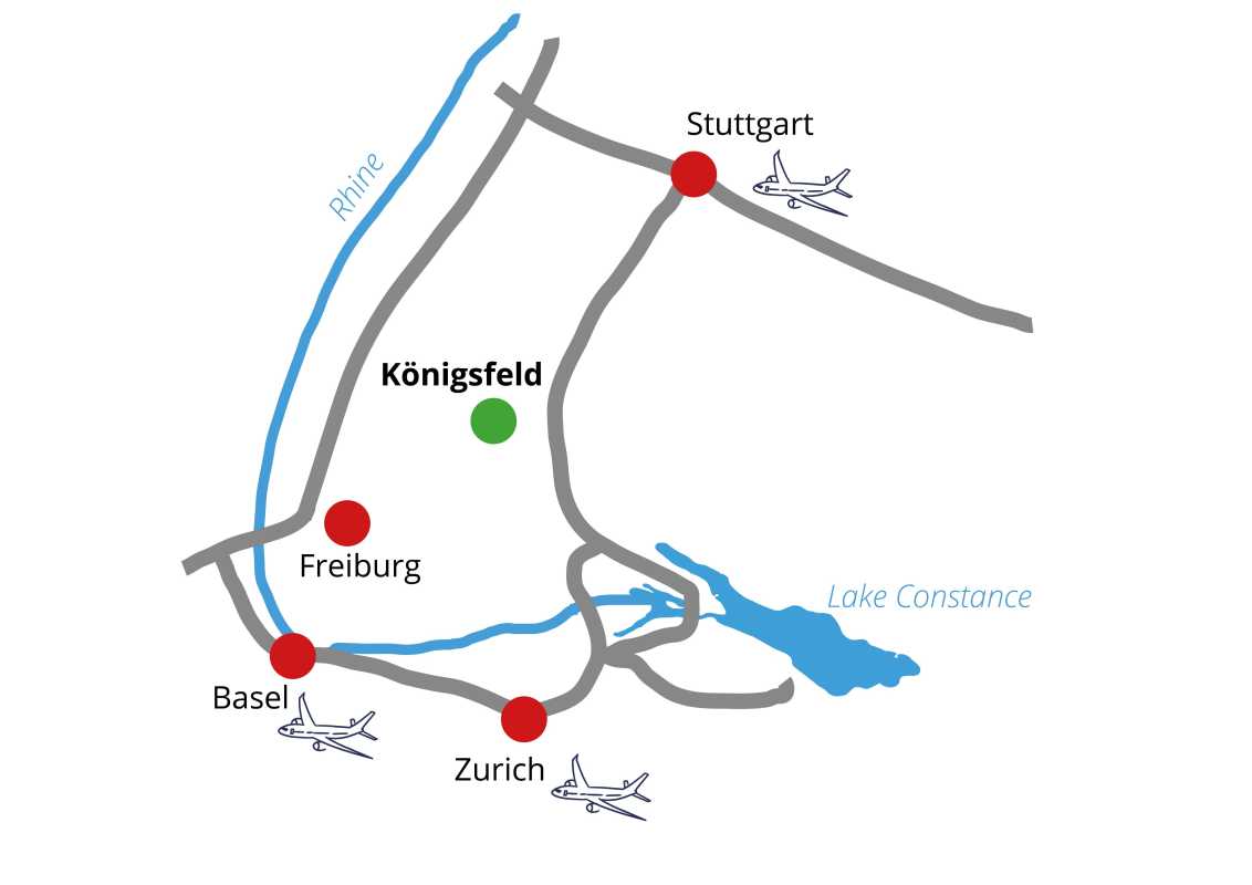 Via Stuttgart / Rottweil or coming from Lake Constance. Final train stop is Villingen im Schwarzwald.Change to bus or take a Taxi (10 Km) to Königsfeld (Busbahnhof).